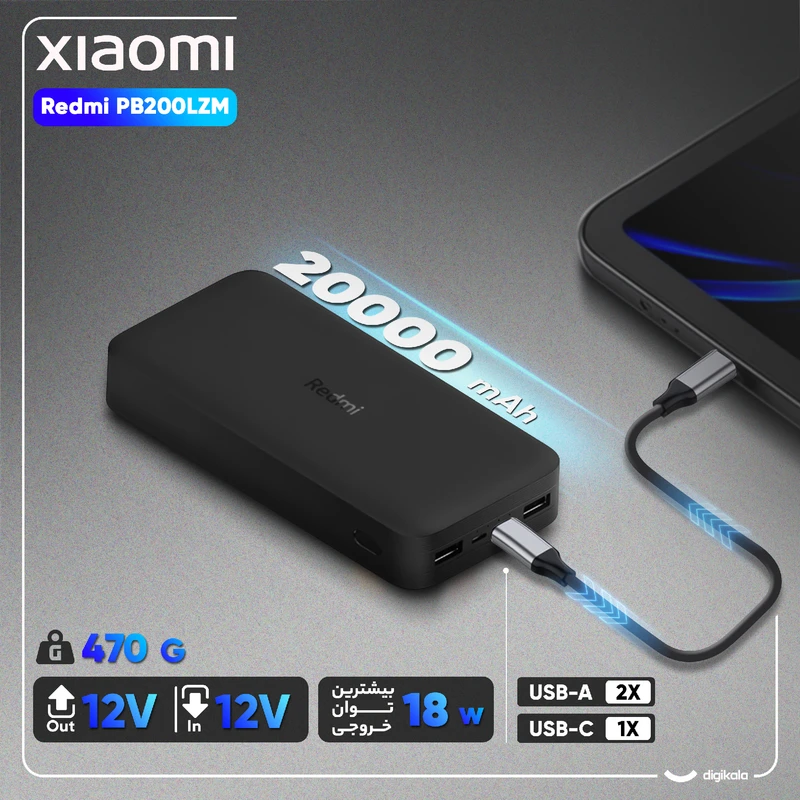 پاوربانک Redmi PB200LZM ظرفیت 20000 میلیآمپر | شارژ سریع | سه خروجی | دارای پورت خروجی دوگانه USB_A و پورت ورودی دوگانه USB-C و MicroUSB